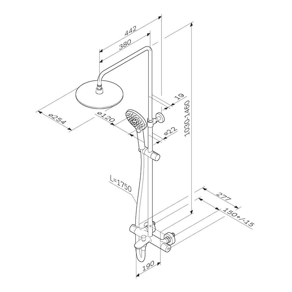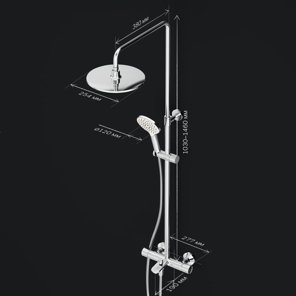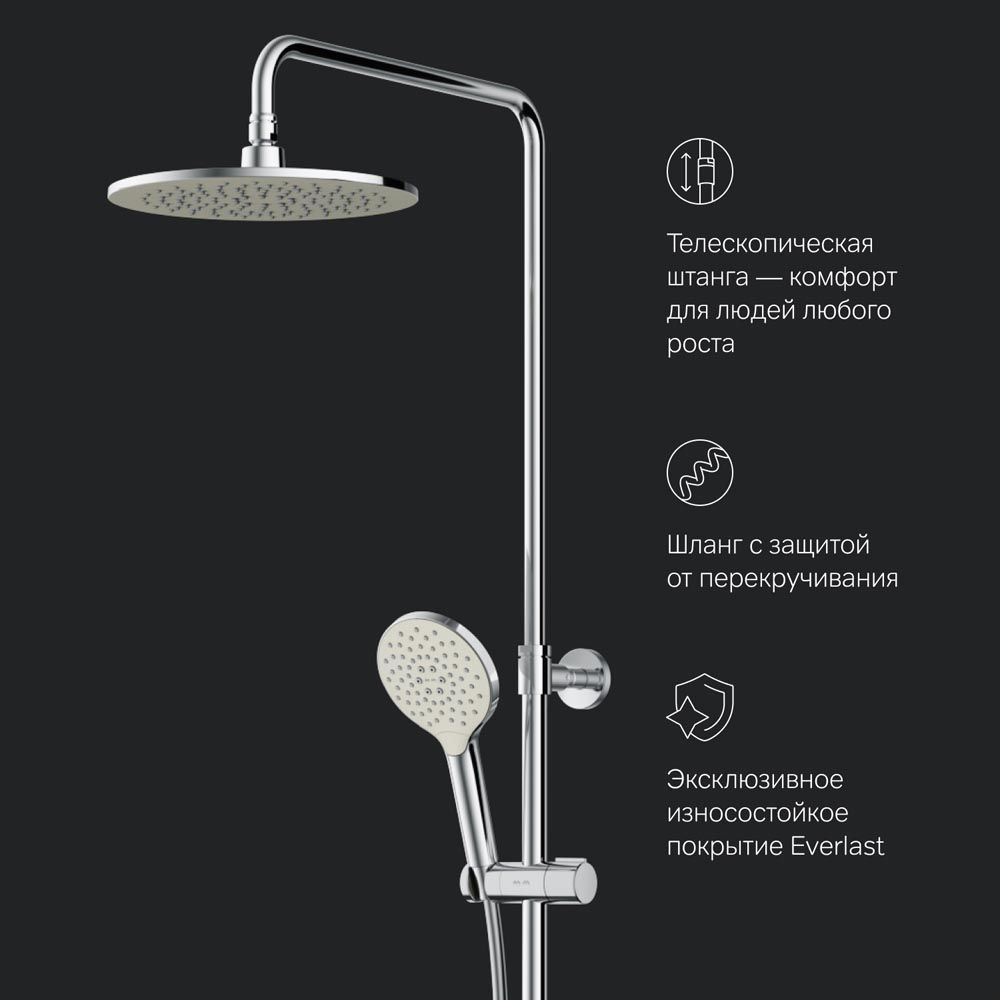 Продуманные детали для удобства использования: штанга регулируется по высоте в диапазоне от 1030 до 1460 мм обеспечивая комфорт для людей любого роста шаровый шарнир в держателе верхнего душа позволяет регулировать угол его наклона душевой шланг 1750 мм верхний душ диаметром 250 мм ручной душ диаметром 120 мм.