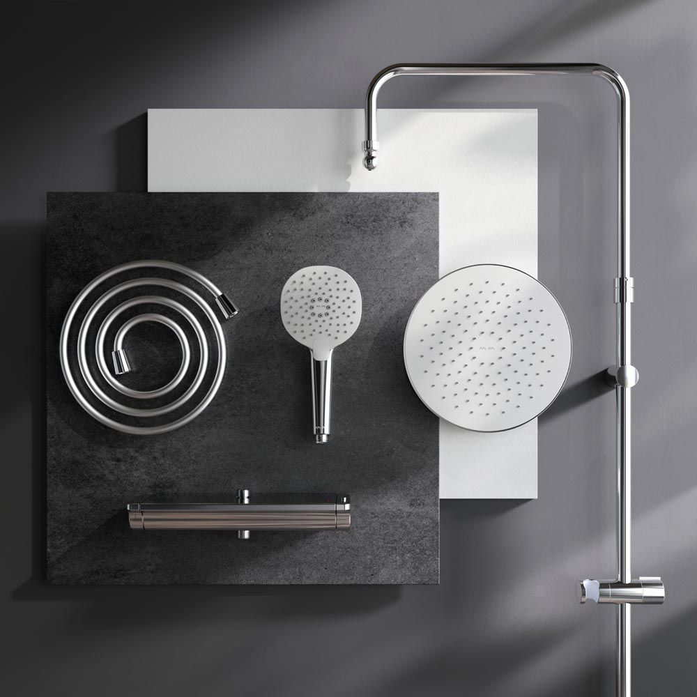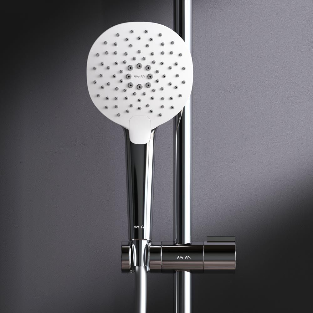 Душевой система AM PM Spirit V2.0 F0770A400. Экстраординарный дизайн: современный минималистичный стиль и экстра-функциональность. Смеситель для душа с термостатом: настенная установка, картридж с термоэлементом, стопор безопасности на 38°C, запирающий и переключающий вентиль, выход для душа 1/2, встроенные обратные клапаны, встроенные фильтры, эксцентрики, подключение G 1/2. 3 режима ручного душа: Spray, EnerJet, Spray + Massage, переключатель режимов Simple Switch Push, функция Rub&Clean для легкой очистки душевых форсунок. Регулируемый в трех плоскостях держатель для ручного душа, шаровый шарнир в держателе верхнего душа позволяет регулировать угол наклона, шарнирное соединение защищает душевой шланг от перекручивания.