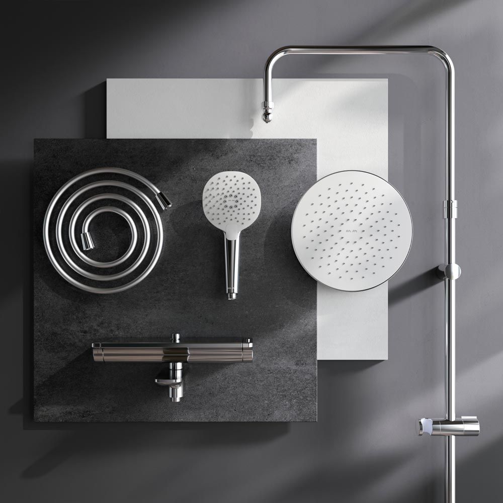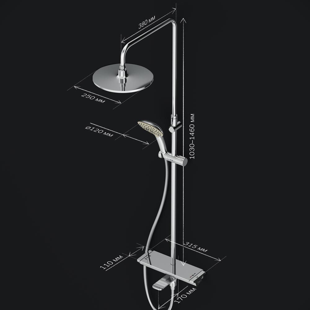 Душевая система AM PM Spirit V2.0 F0770A500 с термостатом. Экстраординарный дизайн: современный минималистичный стиль и экстра-функциональность. Смеситель для душа с термостатом: настенная установка, картридж с термоэлементом, стопор безопасности на 38 градусов, запирающий и переключающий вентиль, выход для душа 1/2, встроенные обратные клапаны, встроенные фильтры, эксцентрики, подключение G 1/2. Удобный поворотный излив. 3 режима ручного душа: Spray, EnerJet, Spray + Massage, переключатель режимов Simple Switch Push, функция Rub&Clean для легкой очистки душевых форсунок. Регулируемый в трех плоскостях держатель для ручного душа, шаровый шарнир в держателе верхнего душа позволяет регулировать угол наклона, шарнирное соединение защищает душевой шланг от перекручивания.
