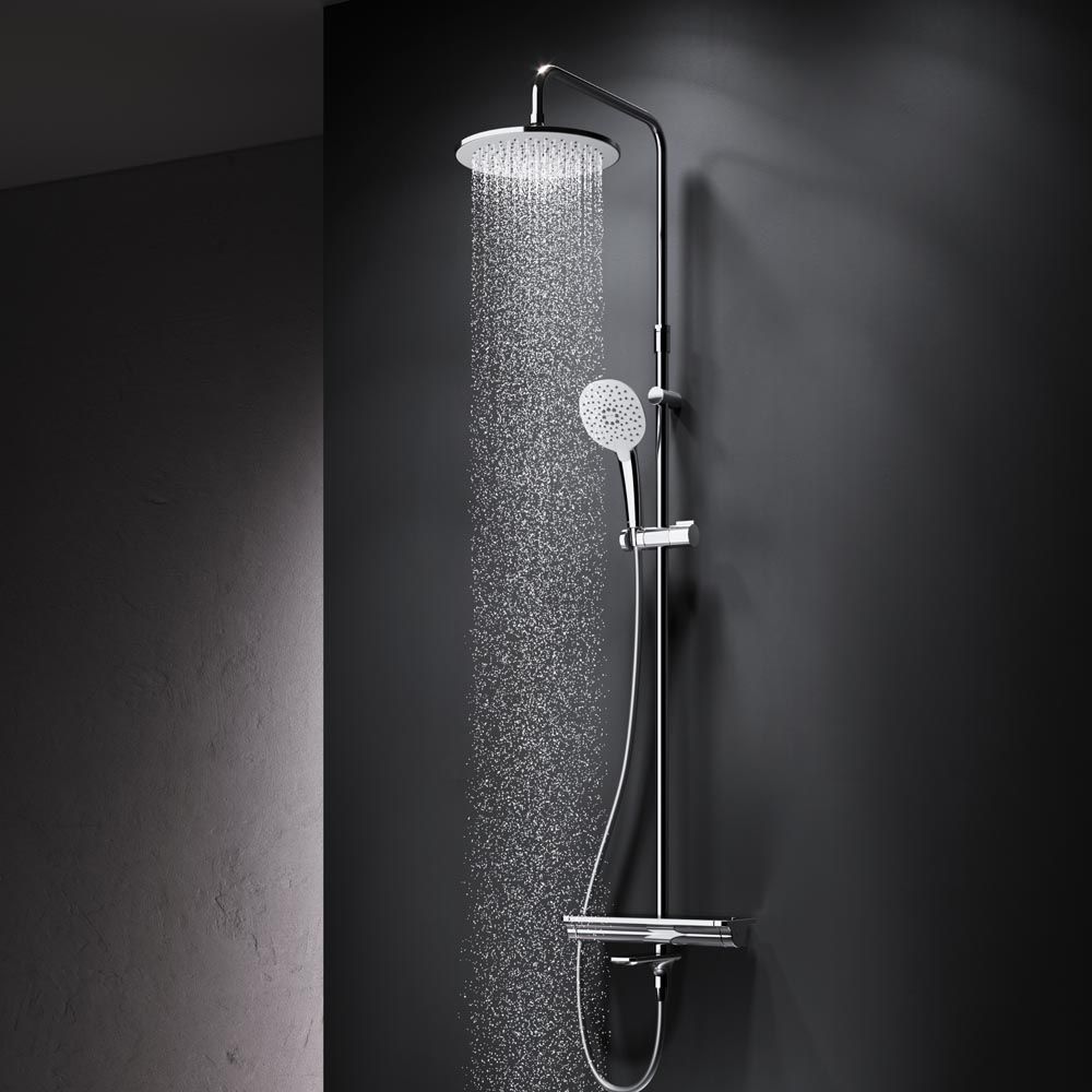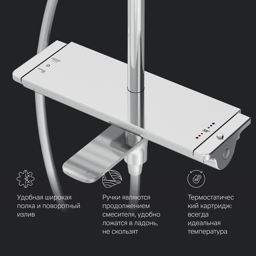 Смеситель для душа с термостатом: настенная установка картридж с термоэлементом стопор безопасности на 38°C запирающий и переключающий вентиль выход для душа 1/2“ встроенные обратные клапаны встроенные фильтры эксцентрики подключение G 1/2“. Удобный поворотный излив. 3 режима ручного душа: Spray EnerJet Spray + Massage переключатель режимов Simple Switch Push функция Rub&Clean для легкой очистки душевых форсунок. Регулируемый в трех плоскостях держатель для ручного душа шаровый шарнир в держателе верхнего душа позволяет регулировать угол наклона шарнирное соединение защищает душевой шланг от перекручивания.