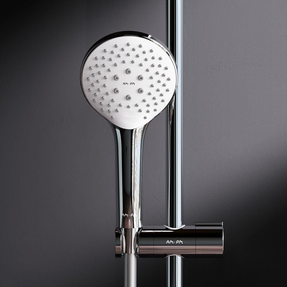 Душевая система AM PM X-Joy F40885A34. Коллекция X-Joy была создана для того, чтобы задавать новые стандарты и радовать вас каждый день! Ультрамодный дизайн ручки придает смесителю дополнительную динамику и дарит непревзойденную легкость управления. Продуманные детали душевой системы для удобства использования: штанга регулируется по высоте в диапазоне от 1030 до 1460 мм, обеспечивая комфорт для людей любого роста, шаровый шарнир в держателе верхнего душа позволяет регулировать угол его наклона, душевой шланг 1750 мм, верхний душ диаметром 220 мм, ручной душ диаметром 110 мм.