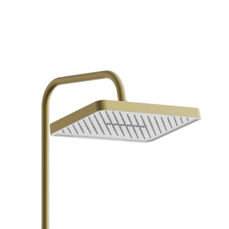 Излив душевой системы оснащён аэратором и в сложенном состоянии служит переключателем потока воды, что добавляет удобства в использовании. Верхний душ размером 320х210 мм изготовлен из ABS-пластика и оснащён силиконовыми форсунками, которые легко очищаются от известкового налёта. Благодаря шарниру верхний душ можно регулировать по наклону вдоль всей оси, а его высота настраивается с помощью телескопической конструкции штанги.