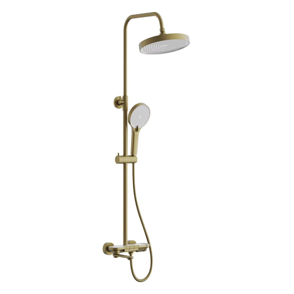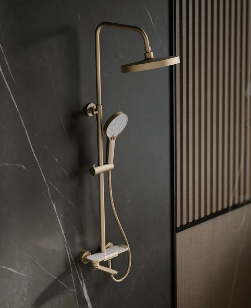 Излив душевой системы оснащён аэратором и может быть сложен для экономии пространства, когда он не используется. Верхний душ диаметром 255 мм изготовлен из ABS-пластика и оснащён силиконовыми форсунками, которые легко очищаются от известкового налёта. Благодаря шарниру верхний душ можно регулировать по наклону вдоль всей оси, а его высота настраивается с помощью телескопической конструкции штанги.