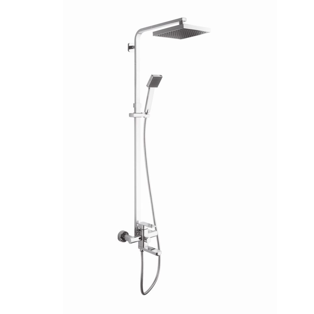 Душевая система D-Lin D10A11, хром. Управление: рычажное. Ручной душ: да. Размер верхнего душа: 20x20 см. Излив для наполнения ванны: да.
