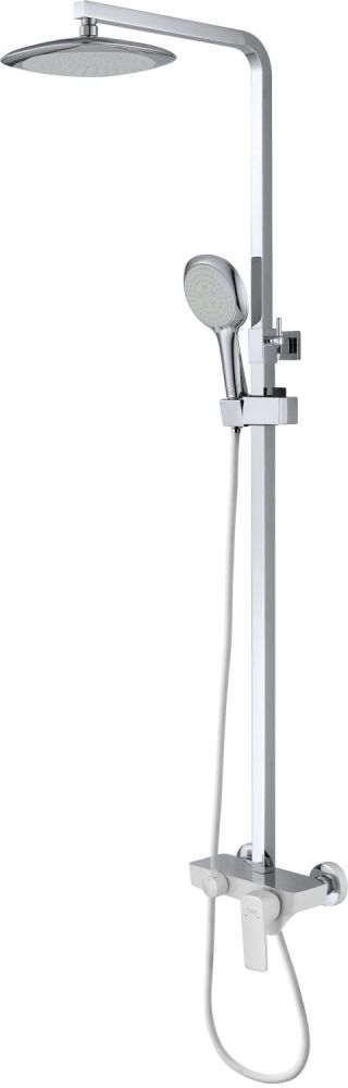 Функциональная душевая система в благородном белом цвете с широкой лейкой, с эффектом настоящего тропического ливня. Штанга регулируется под любой рост.