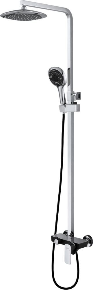 Функциональная душевая система в изысканном черном цвете с широкой лейкой, с эффектом настоящего тропического ливня. Штанга регулируется под любой рост.