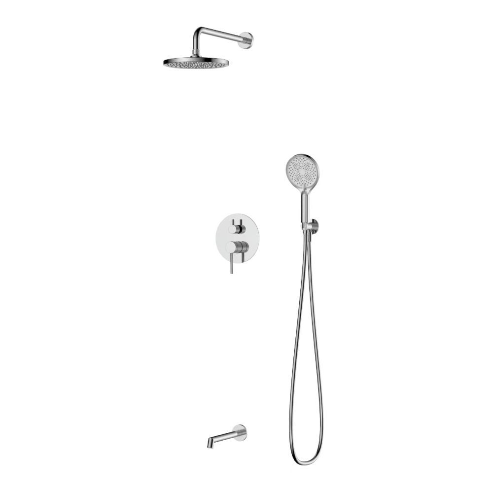смеситель: внешняя часть накладка, ручка, излив, встраиваемая часть блок, держатель ручного душа, ручная лейка 3 режима, держатель верхнего душа, тропический верхний душ, душевой шланг 1,5м, паспорт изделия |