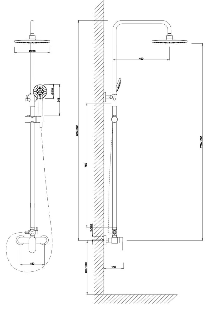 Выдвижная телескопическая стойка (нерж. сталь, хром):   Высота функциональная 900 - 1200мм , Диаметр 24мм, Вылет верхнего душа 420мм, Держатель ручной лейки плавающий FightFix Лейка верхнего душа (ABS-пластик,хром): на подвижном шарнире, Диаметр 225мм, Форсунки Self-Clean Device,   Eco system Ручная лейка: диаметр 110мм, 5 режимов, Форсунки Self-Clean Device,  Eco system Cмеситель латунный без излива: Картридж универсальный 35мм, переключатель отдельный двухканальный (ручной душ - верхний душ), Комплектация: душевой шланг 150см (в металл. оплетке), монтажный комплект