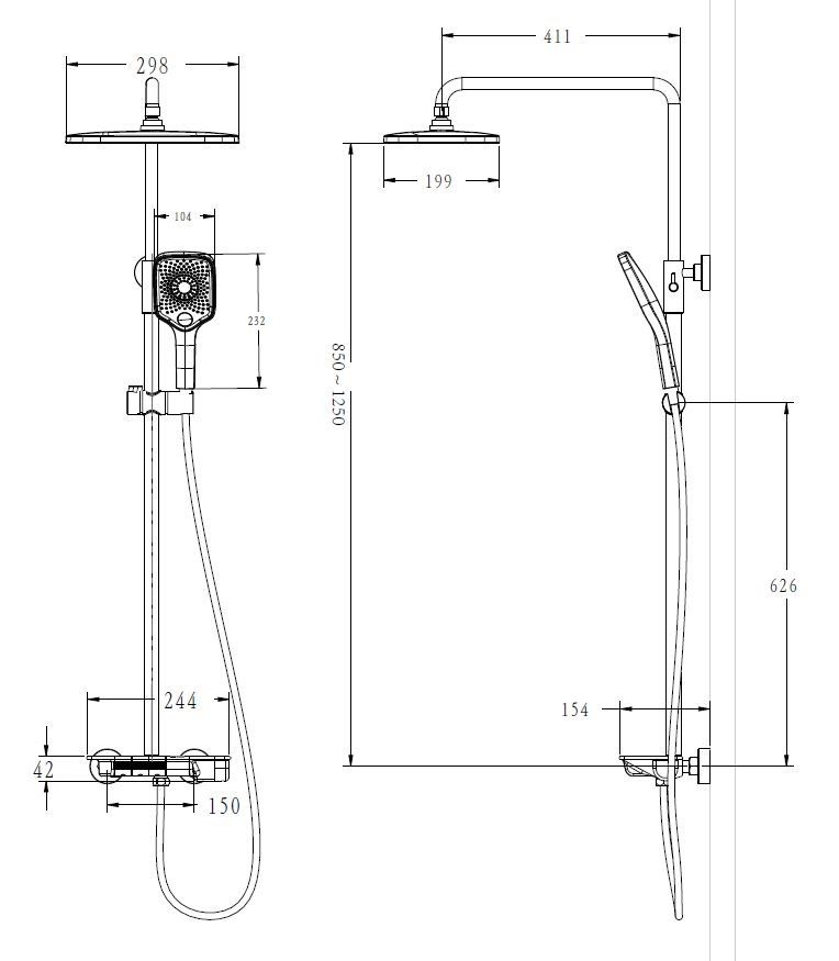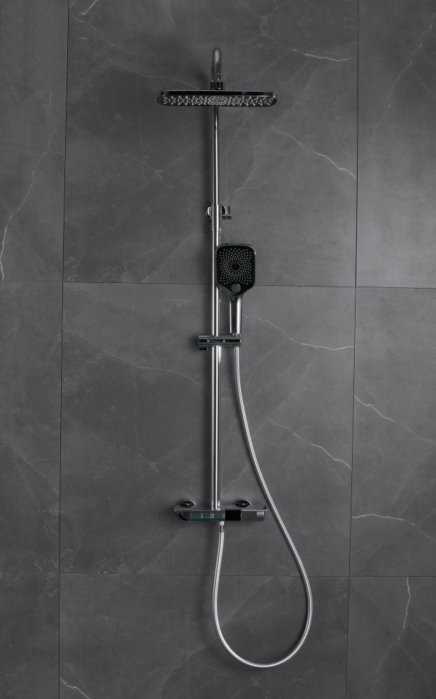 "Душ. система с дисплеем и датчиком температуры. Параметры: Максимальная высота телескопической стойки - 1250мм; Вылет верхнего душа: 411мм; Диаметр верхнего душа : 300*200мм; Диаметр ручного душа: 104мм; 1. Смеситель с массивной полкой и кнопочным управлением режимами, возможность включать несколько режимов одновременно. 2. Гидро-индикатор температуры воды (показывает фактическую температуру потока воды, питание электрических датчиков осуществляется за счет проходящего потока воды). 3. Скрытый излив. 4. Ручной душ с кнопочным управлением, 3 режима."