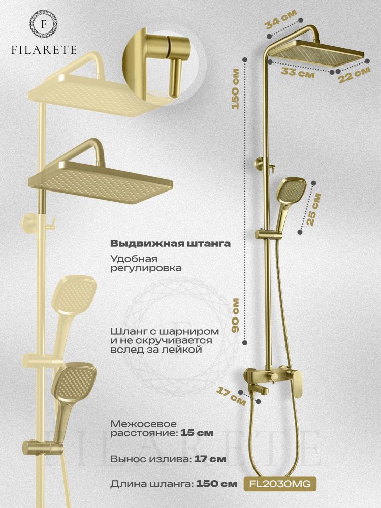 верхний душ, душевая штанга с держателем лейки, ручной душ, смеситель, шланг, эксцентрики, декоративные отражатели |