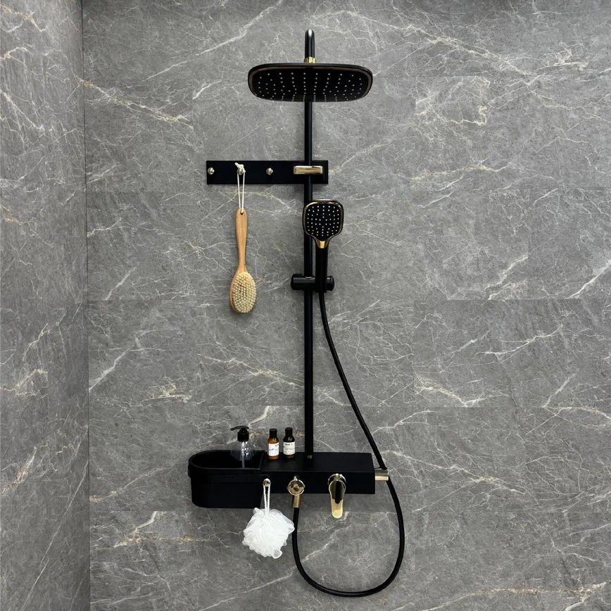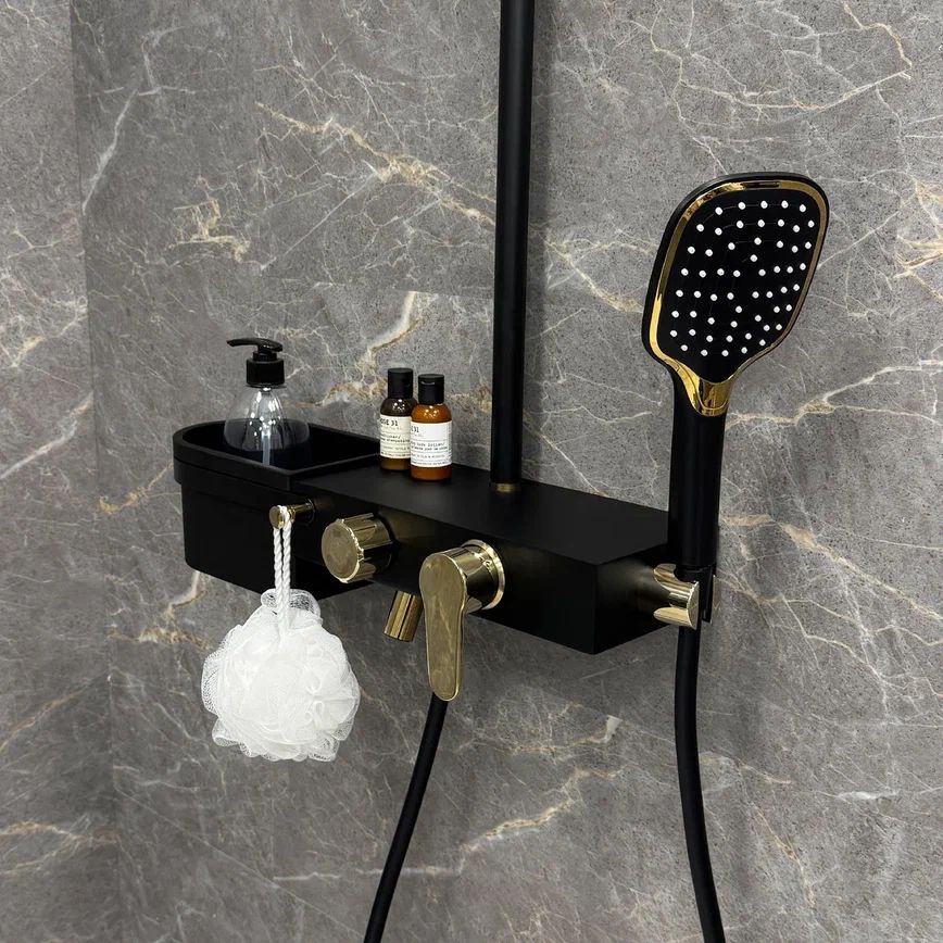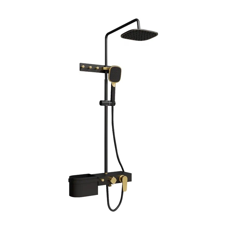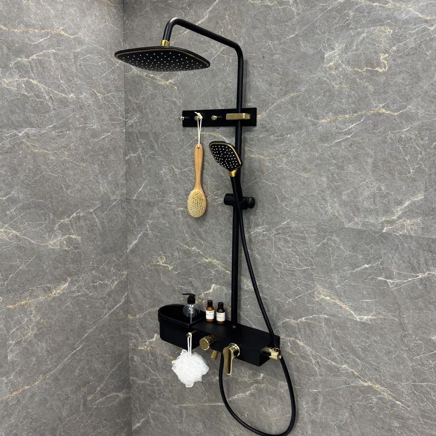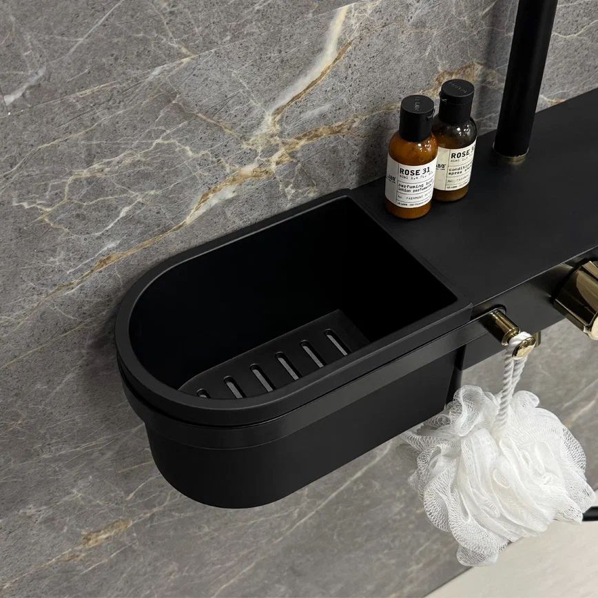 В комплекте есть все, что нужно для максимально комфортного использования: тропический душ, смеситель с поворотным (360 градусов) изливом для наполнения ванны, ручная лейка с держателем, а также глубокая полка для хранения гелей и шампуней и планка с крючками.