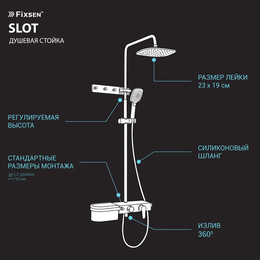 Не упустите возможность приобрести эту стильную и функциональную душевую систему с тропическим душем и ручной лейкой Fixsen SLOT FX-9300B, которая станет украшением вашей ванной и подарит комфорт на каждый день.