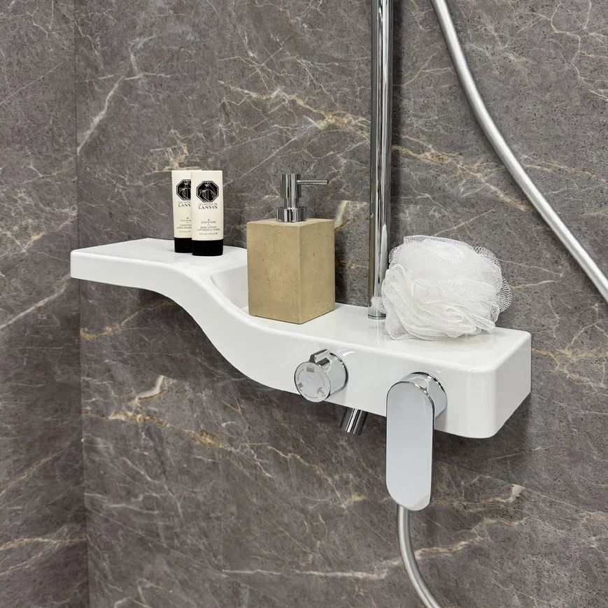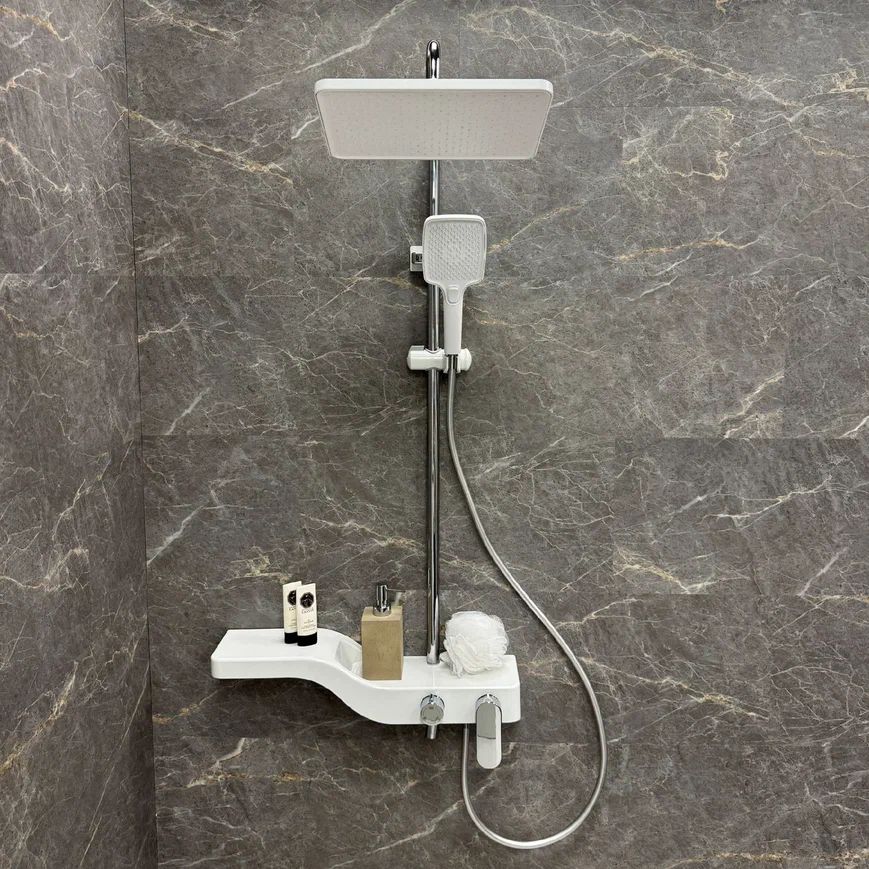 В комплекте есть все, что нужно для максимально комфортного использования: тропический душ, смеситель с поворотным (360 градусов) изливом для наполнения ванны, ручная лейка с держателем, а также полка для удобного хранения гелей и шампуней.