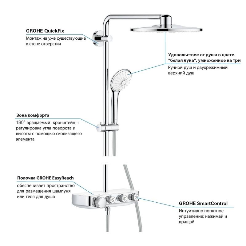 Надежная и ослепительная хромовая поверхность GROHE StarLight сохранит свой великолепный внешний вид на долгие годы. Благодаря системе GROHE QuickFix установка системы будет простой и быстрой, ведь кронштейн можно установить в уже существующие отверстия в стене.