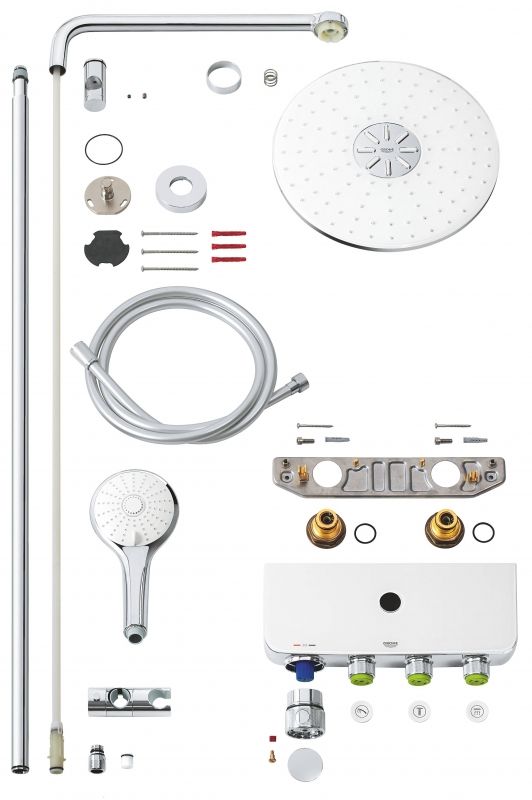 Инновационная технология GROHE SmartControl позволяет переключаться между режимами струи и комбинировать потоки верхнего и ручного душа, равно как и регулировать напор воды с помощью простого нажатия и поворота кнопки. Технология EcoJoy позволяет сократить расход воды.
