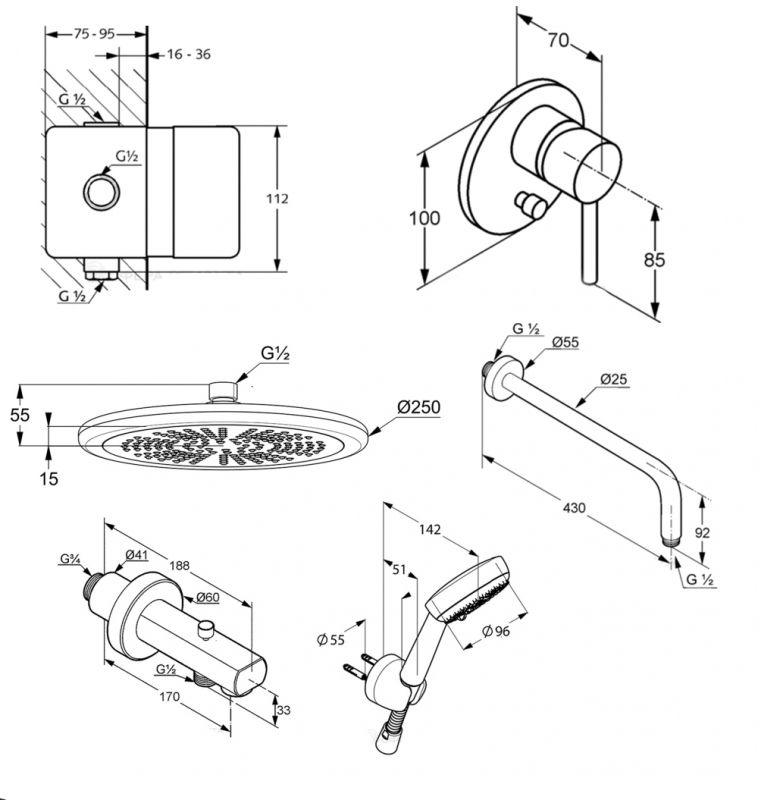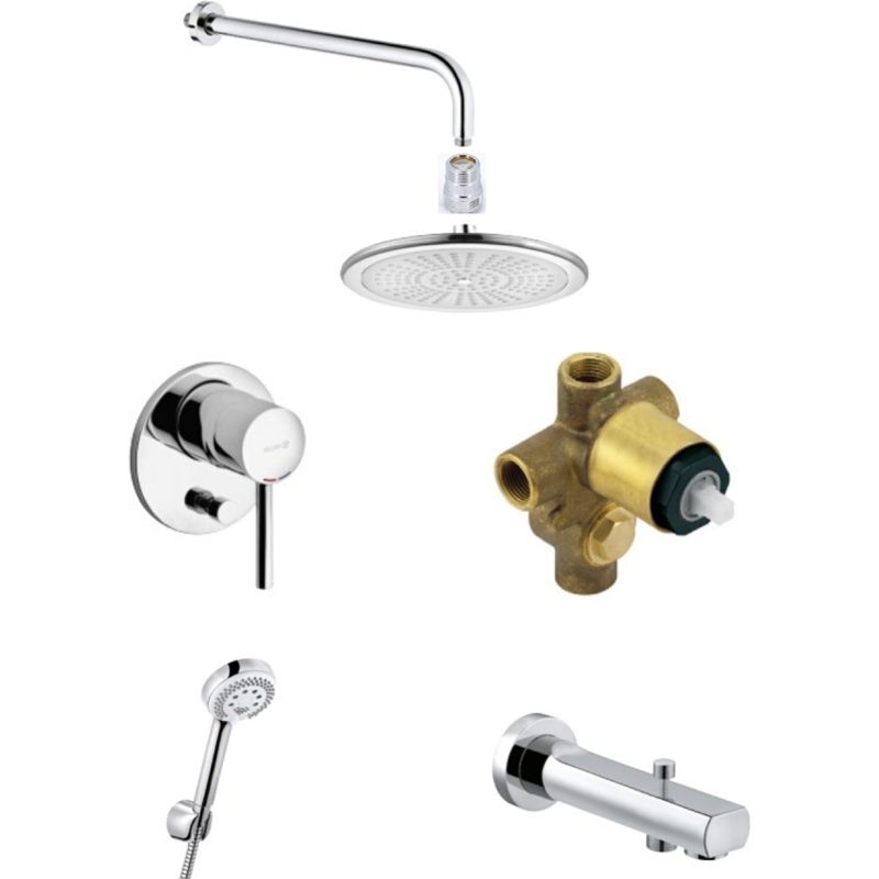 В комплекте поставки: смеситель (внешняя и внутренняя часть), душевой гарнитур, верхний душ, кронштейн, излив для ванны, клапан защиты от обратного потока.