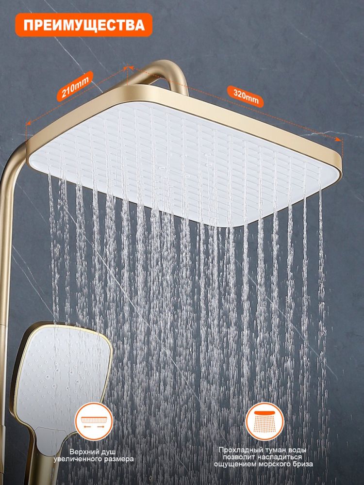 Верхний душ 300х190 мм регулируется по высоте благодаря телескопической штанге и по наклону с помощью встроенного шарнира, что обеспечивает максимальный комфорт и удобство использования. Самоочищающиеся силиконовые форсунки предотвращают образование известкового налета и сохраняют чистоту и силу потока воды.