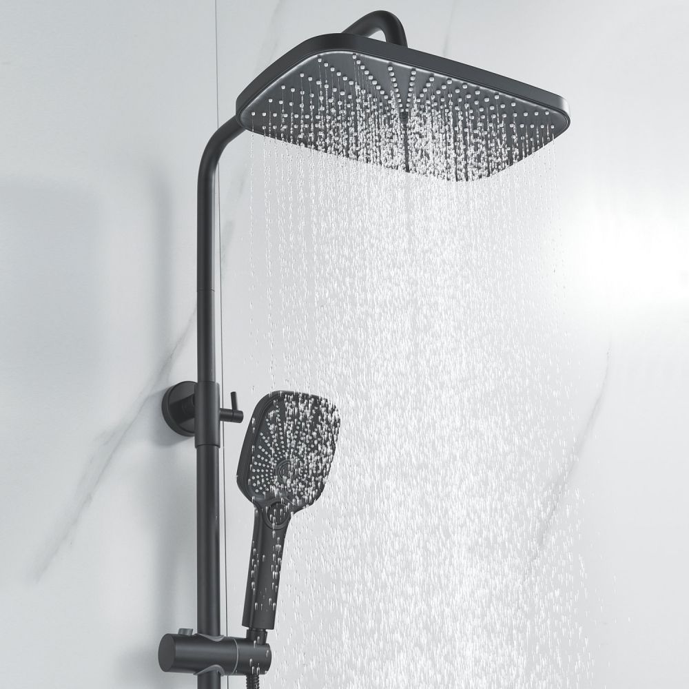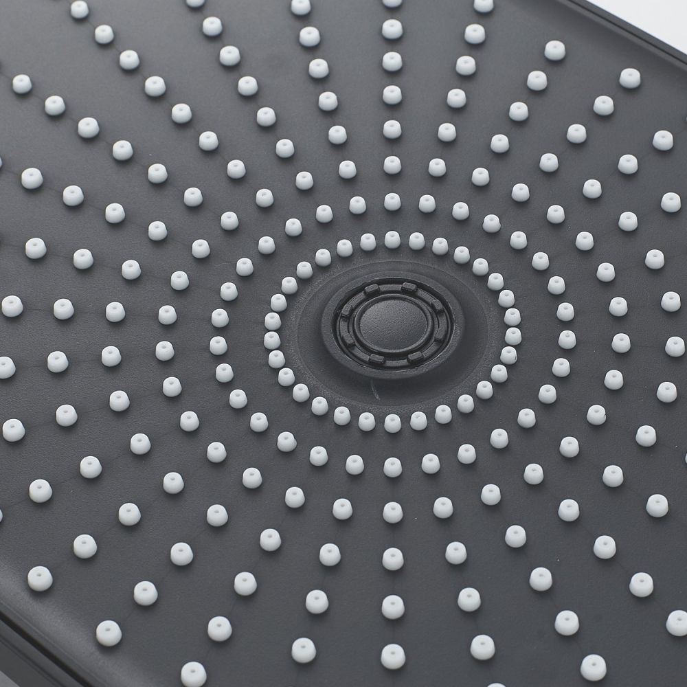 Верхний душ размером 300x190 мм из ABS-пластика регулируется по высоте благодаря телескопической штанге и по наклону с помощью встроенного шарнира, что обеспечивает максимальный комфорт и удобство использования. Самоочищающиеся силиконовые форсунки предотвращают образование известкового налета и сохраняют чистоту и силу потока воды.