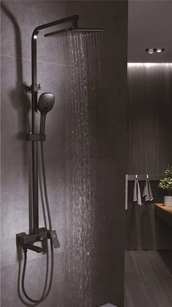 смеситель, верхний душ, штанга с держателем душевой лейки, душевая лейка, шланг, эксцентрики |