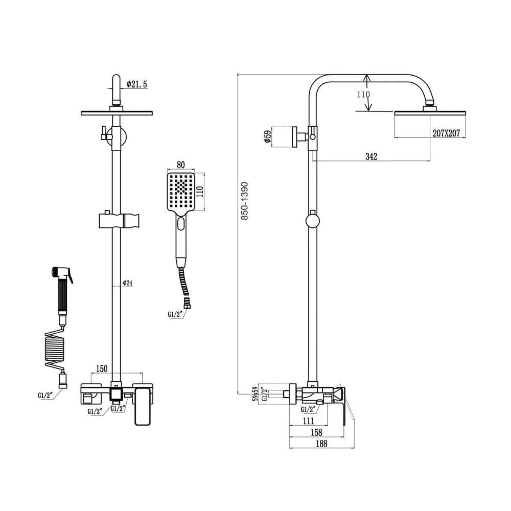 верхний душ, душевая штанга, держатель душевой лейки, ручной душ, смеситель, шланг, гигиеническая лайка, шланг гигиенической лейки, эксцентрики, декоративные чашки |