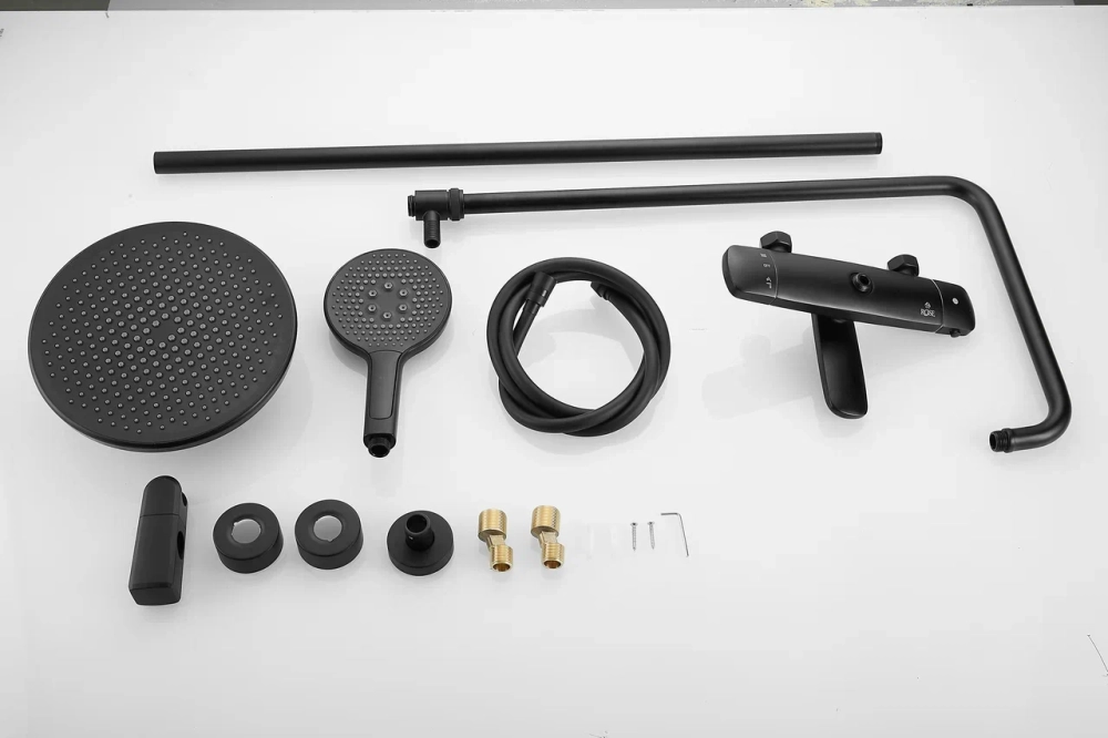 смеситель, верхний душ, штанга с держателем душевой лейки, душевая лейка, шланг, эксцентрики |