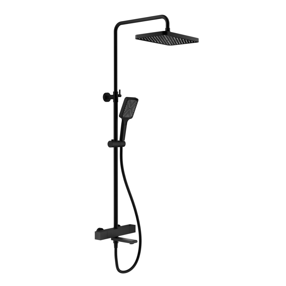 Душевая система с термостатом Splenka S224.26.06, черный. Управление: термостат. Механизм: термостатический картридж. Стандарт подводки: G 1/2. Размер верхнего душа (ШхД): 320х210 мм. Количество режимов струи ручного душа: 3. Регулируемая душевая штанга: 1160-1560 мм. Монтаж: на стену. Излив - функция переключения.