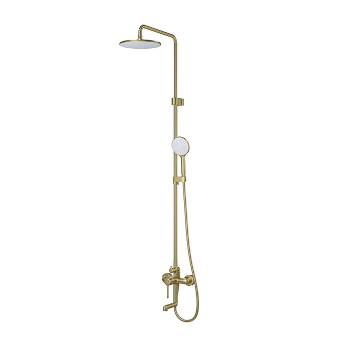 Стильная функциональная душевая система Aiger, где удачно сочетается актуальный современный дизайн и трендовый оттенок матового золота с брашированным покрытием. Тонкая удлиненная ручка добавляет смесителю изящества и комфорт в управлении.