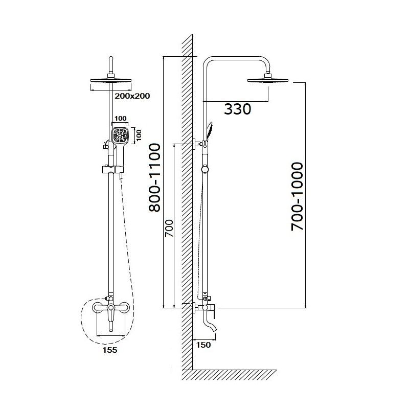 верхний душ, душевая штанга, держатель душевой лейки, ручной душ, смеситель, шланг |