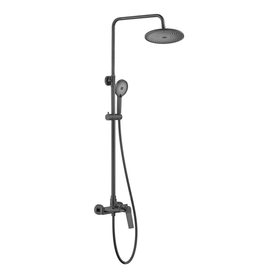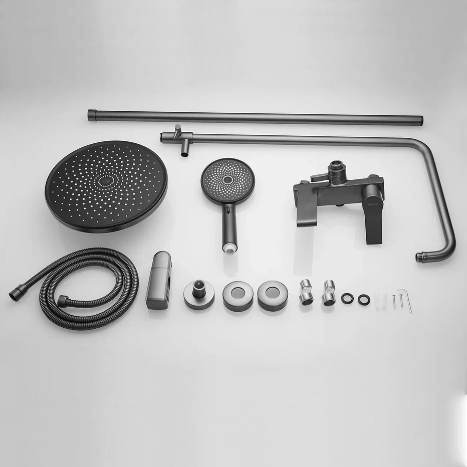 Душевая система Shevanik S8336T, оружейная сталь. Количество режимов струи: 3. Размер верхнего душа: 24,5x24,5 см. Управление: рычажное. Излив для наполнения ванны: да.