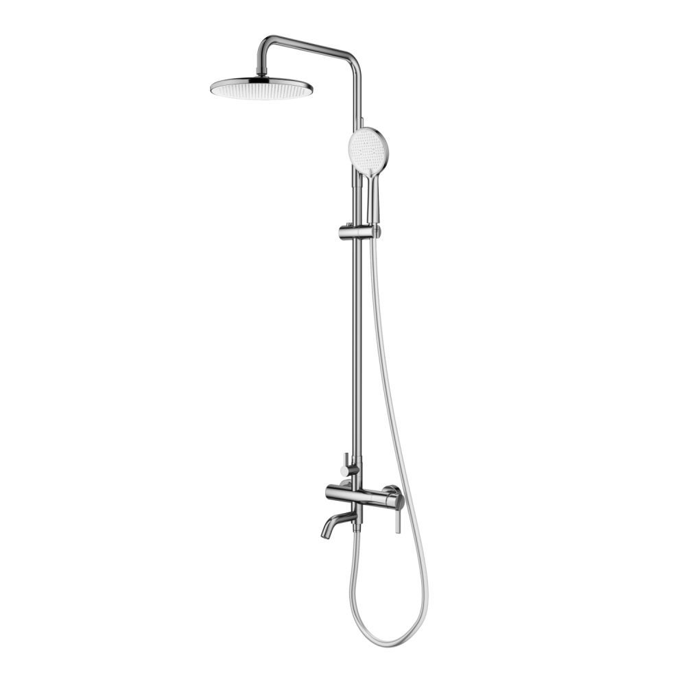 Душевая система Splenka S221.24.05, сатин. Душевая система подходит для ванны и душа. Излив у системы имеет функцию переключения режима подачи воды. Верхний душ имеет круглую форму, из авс-пластика. Верхний душ - ∅250мм. Душевая лейка - 3 режима. Гарантия 5 лет.