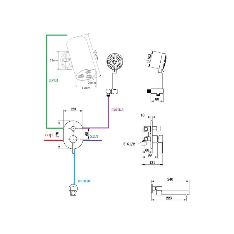 смеситель, внутренняя часть, верхний душ, шланговое подключение с держателем лейки, душевая лейка, шланг, излив |