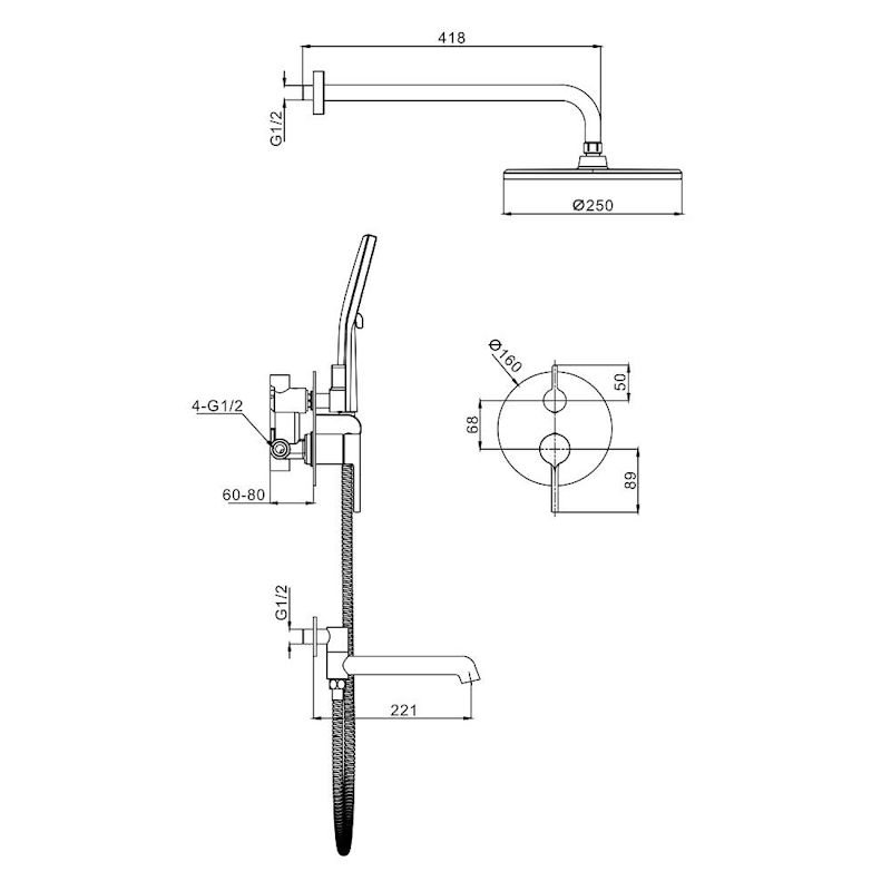 смеситель, внутренняя часть, шланговое подключение с держателем лейки, душевой шланг, верхний душ с кронштейном, излив |