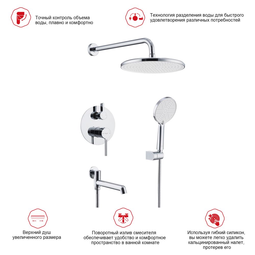 смеситель, внутренняя часть, шланговое подключение с держателем лейки, душевой шланг, верхний душ с кронштейном, излив |