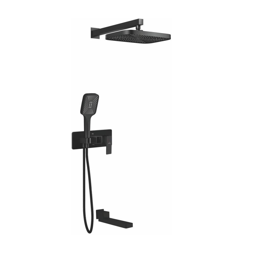 смеситель, верхний душ, кронштейн верхнего душа, шланговое подключение с держателем душевой лейки, душевая лейка, шланг, излив |