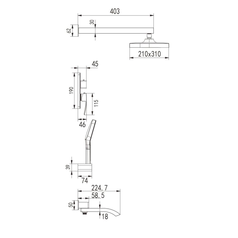 смеситель, верхний душ, кронштейн верхнего душа, шланговое подключение с изливом, душевая лейка, шланг, держатель душевой лейки |
