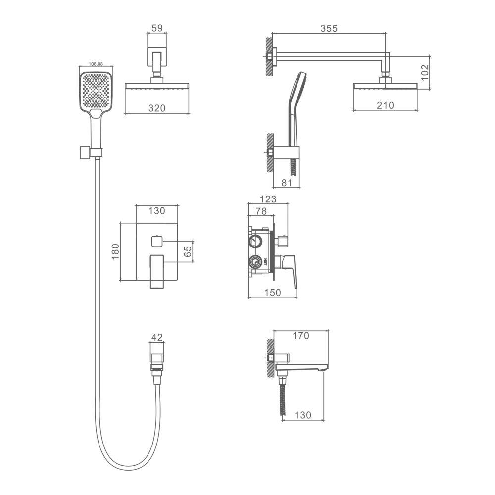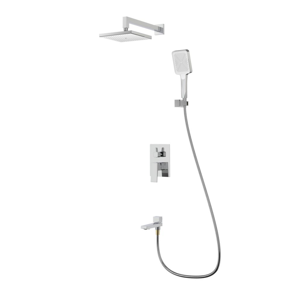 смеситель, внутренняя часть, шланговое подключение с держателем лейки, душевой шланг, верхний душ с кронштейном, излив |