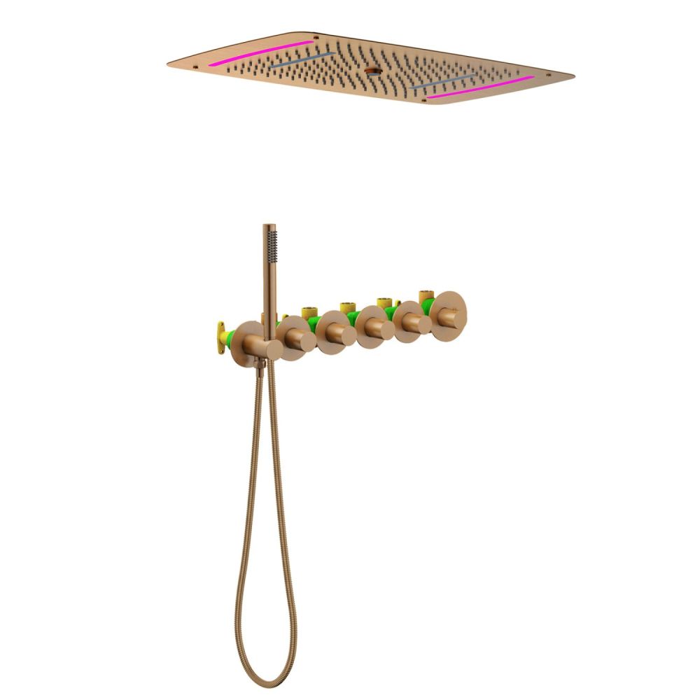 Встраиваемый блок управления душевой системой (латунный) - 1 шт. Корпус потолочного душа (латунный) - 1 шт. Душевая панель (латунная) 680*430 мм - 1 шт. Винты с гайками для крепления подвесных кронштейнов (комплект) - 4 шт. Держатель ручной лейки с подключением душа (латунный) - 1 шт. Подвесные кронштейны - 2 шт. Подводка к тропическому душу - 3 шт. Ручка дивертора - 4 шт. Ручка управления термостатом - 1 шт. Декоративные накладки с гильзами (комплект) - 6 шт. Ручная лейка (латунная) - 1 шт. Соединительная трубка для подключения ручного душа - 1 шт. Шланг душа 1,5 м - 1 шт. Блок управления подсветкой - 1 шт. Инвертор (преобразователь тока) - 1 шт. Т-образный соединитель проводов - 1 шт. Скрытый провод - 1 шт. Провод блока управления подсветкой - 1 шт. Инструкция - 1 шт. |
