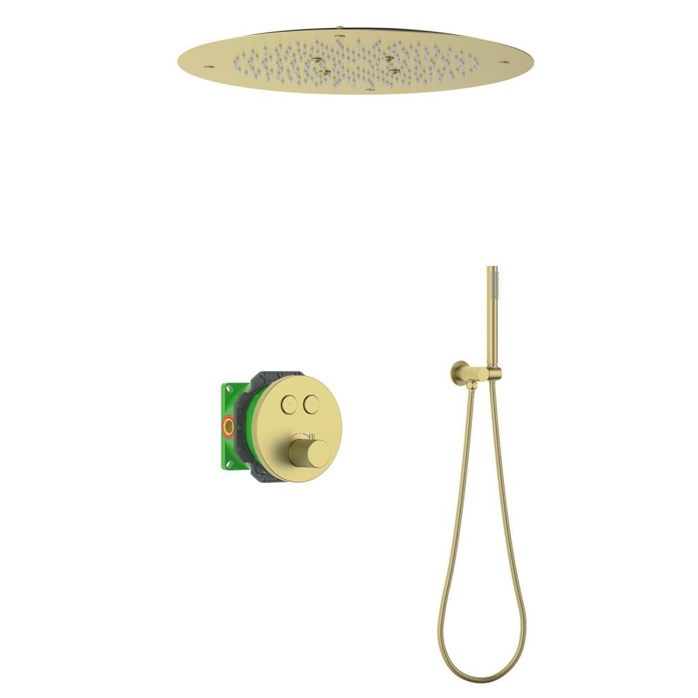 Смеситель с монтажной коробкой, скрытого монтажа, с термостатом - 1 шт. Тропический душ, потолочный, скрытого монтажа, (латунный) - 1 шт. Подводка к тропической лейке 1 м - 1 шт. Ручная лейка (латунь) - 1 шт. Шланг душа 1,5 м (латунный) - 1 шт. Держатель ручной лейки с подключением шланга душа (латунь) - 1 шт. Декоративная накладка смесителя (латунная) - 1 шт. Ручка управления термостатом - 1 шт. Инструкция - 1 шт. |