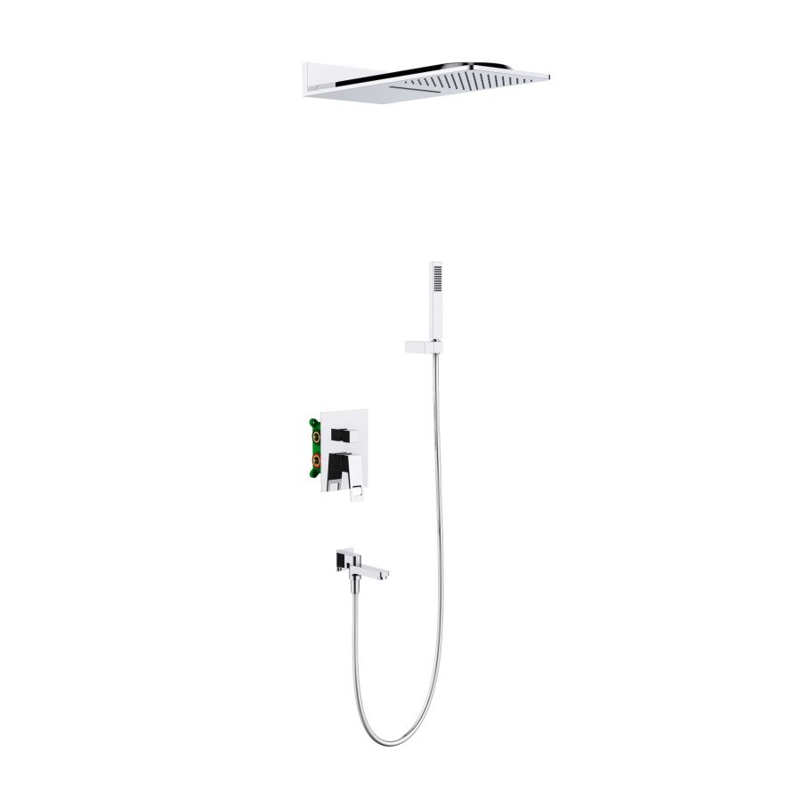Смеситель с монтажной коробкой, скрытого монтажа - 1 шт. Тропический душ, настенный, скрытого монтажа, (латунный) - 1 шт. Крепежные углы для тропического душа - 1 шт. Ручная лейка 1- режимная (латунная) - 1 шт. Излив поворотный с подключением душа (латунный) - 1 шт. Декоративная накладка смесителя (латунная) - 1 шт. Ручка управления смесителем - 1 шт. Шланг душа 1,5 м (латунный) - 1 шт. Ручка дивертора - 1 шт. Инструкция - 1 шт. |