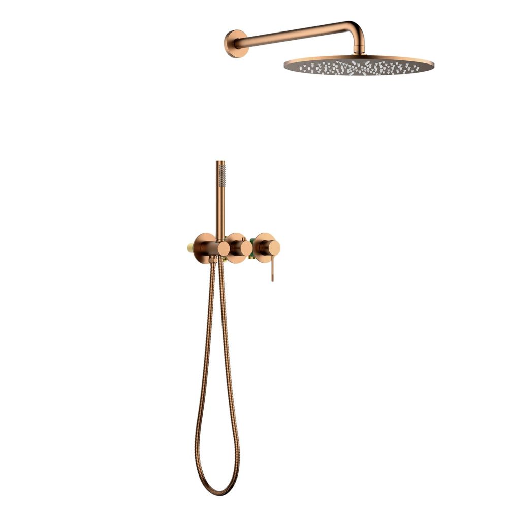 Смеситель скрытого монтажа - 1 шт. Штанга тропического душа - 1 шт. Тропический душ (латунь) - 1 шт. Ручная лейка (латунная) - 1 шт. Держатель ручной лейки с подключением шланга душа (латунь) - 1 шт. Декоративные накладки (латунь) - 3 шт. Ручка дивертора - 1 шт. Ручка управления смесителем - 1 шт. Шланг душа 1,5 м - 1 шт. Инструкция - 1 шт. |