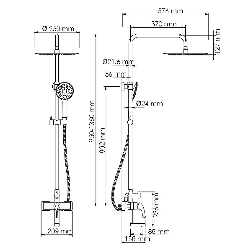 - Стойка для душа: диаметр 2,4 см, регулируемая по высоте.