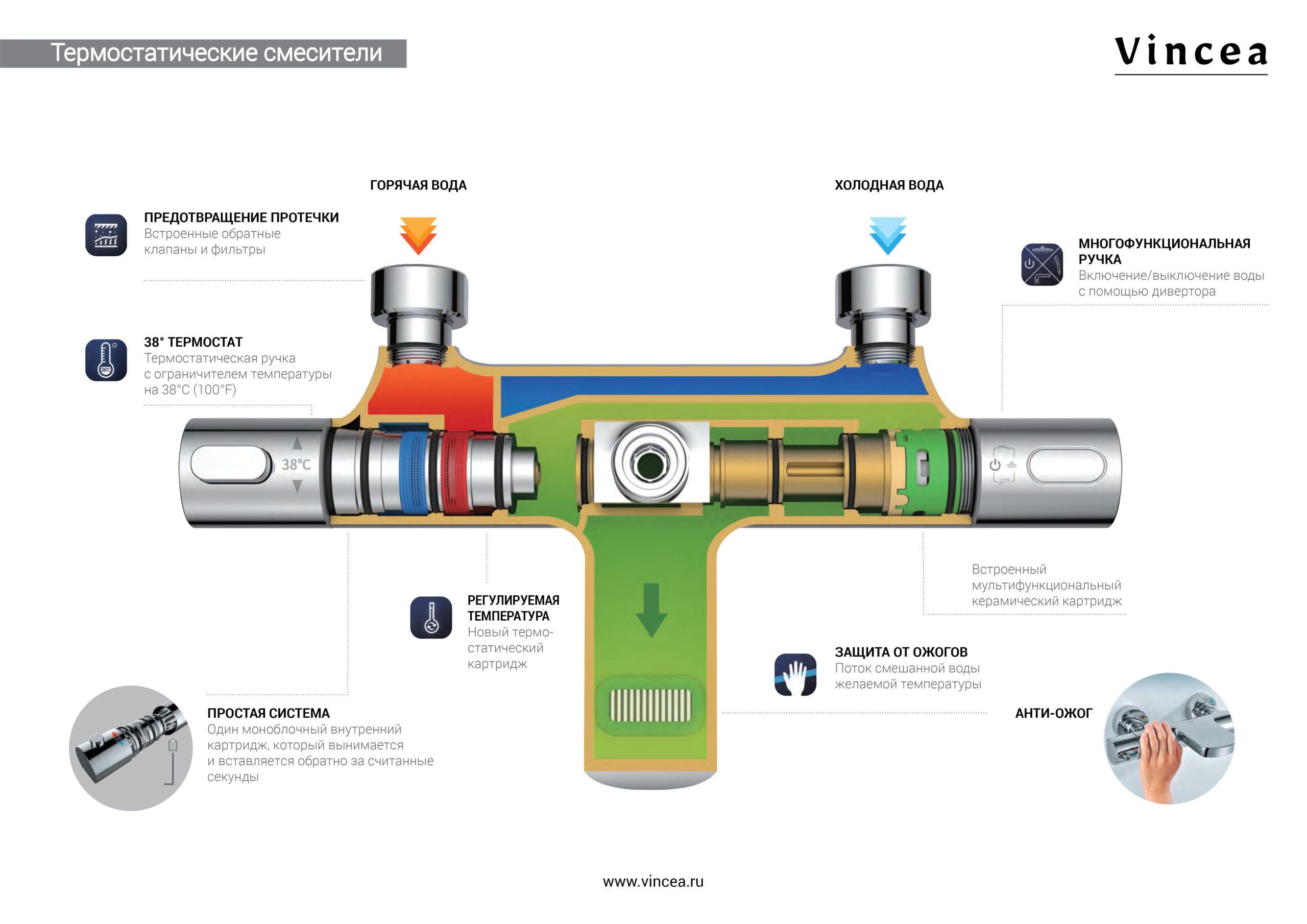 Комплектуется термостатическим картриджем Vernet Трехрежимная душевая лейка