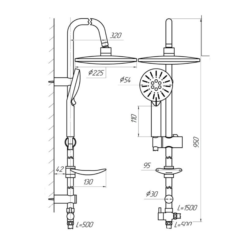 штанга, верхний душ, душевая лейка, держатель лейки, шланг, крепления |