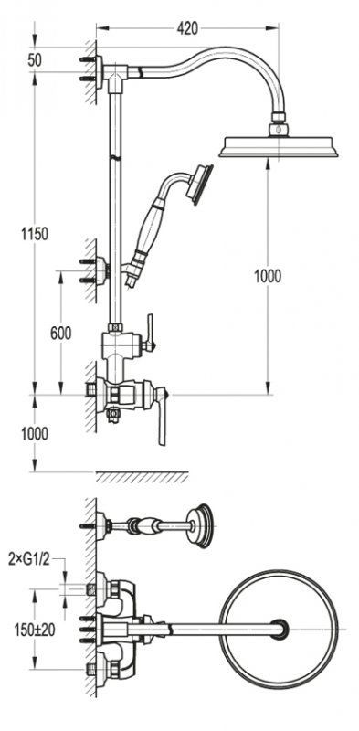 Оснащение: душевая лейка, настенный держатель, кронштейн для верхнего душа, смеситель двухпозиционный, шланг для душа, дивертор
