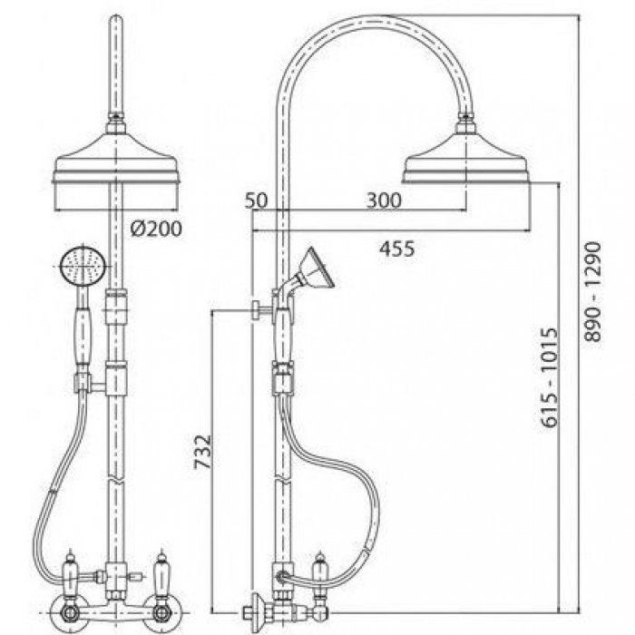 Оснащение: душевая лейка, шланг для душа, держатель душа, дивертор, двухпозиционный смеситель