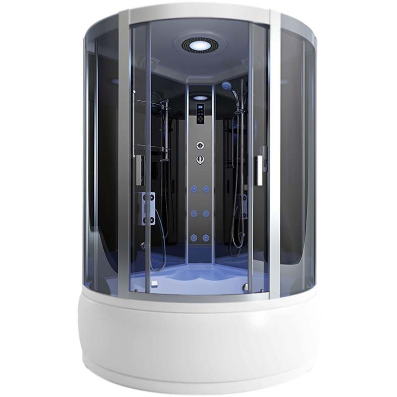 Стеклянный душевой бокс Arcus AS-116 150x150 с двумя раздвижными дверьми, с высоким поддоном, с крышей, с гидромассажем. Отлитое сиденье в поддоне.