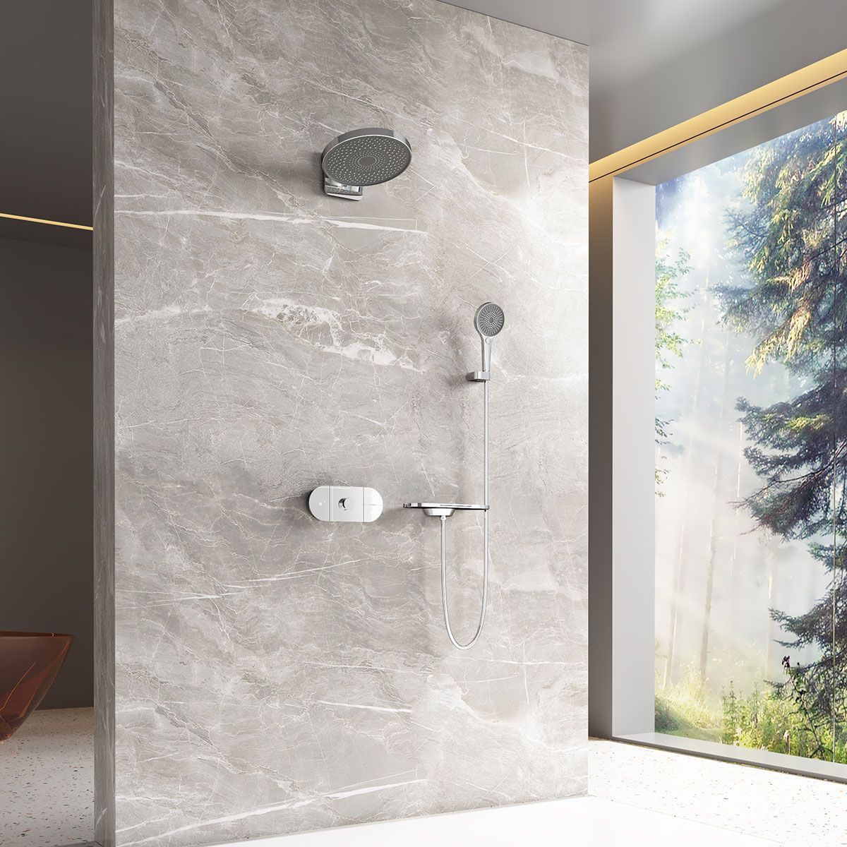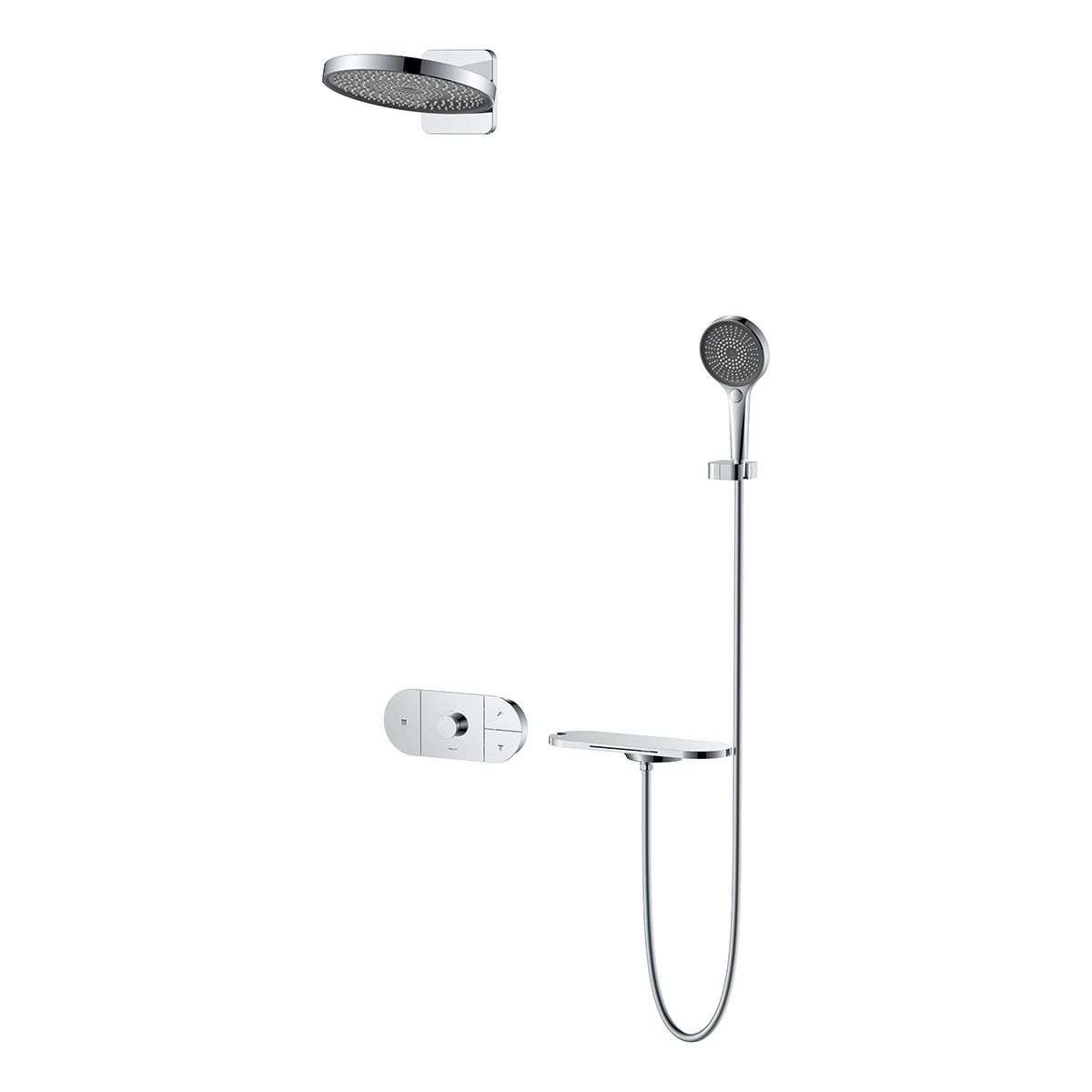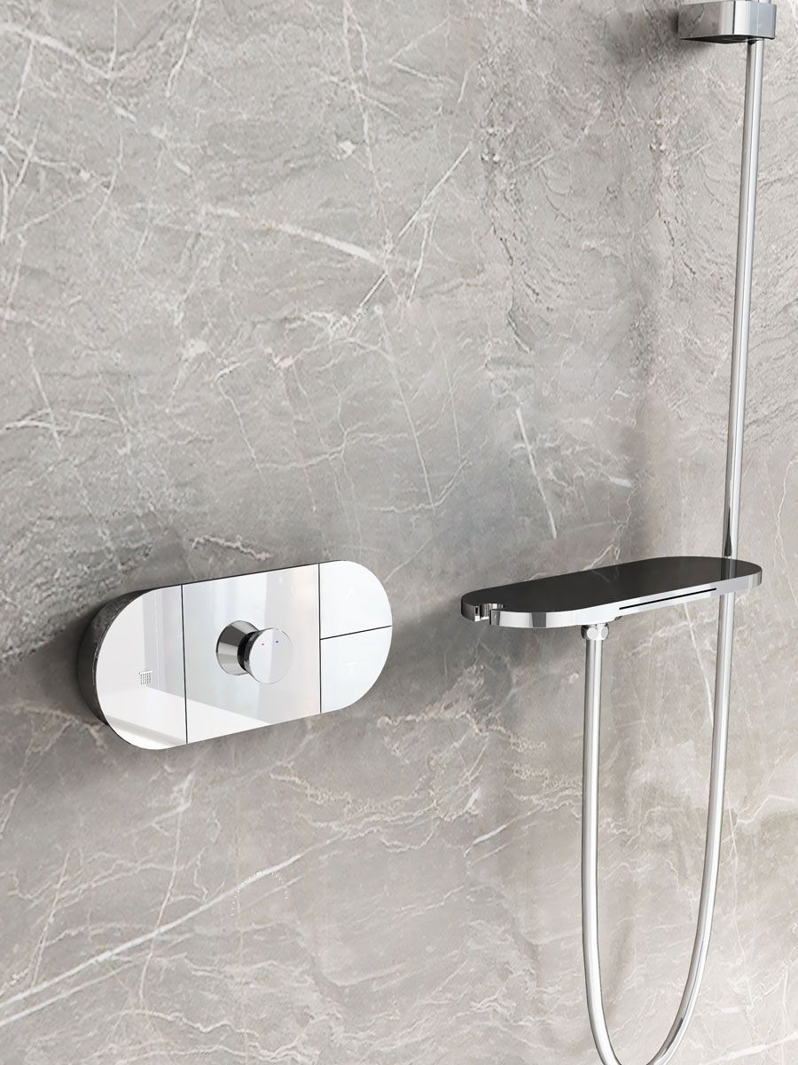 Верхний душ, полка с изливом и держателем ручного душа, ручной душ, смеситель со встраиваемой частью |