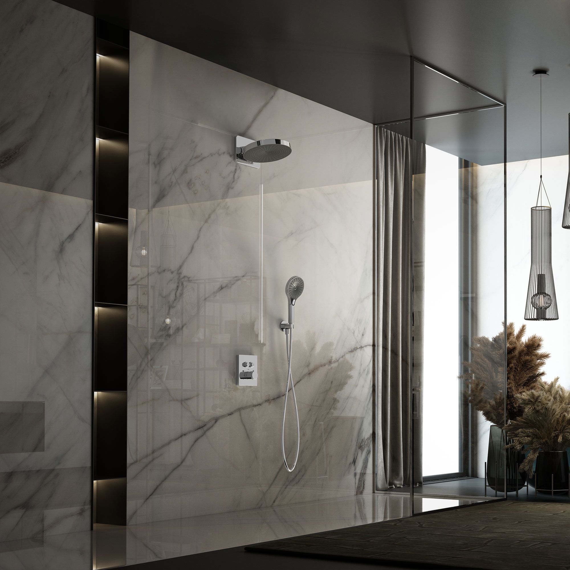 Верхний душ, полка с изливом и держателем ручного душа, ручной душ, смеситель со встраиваемой частью |