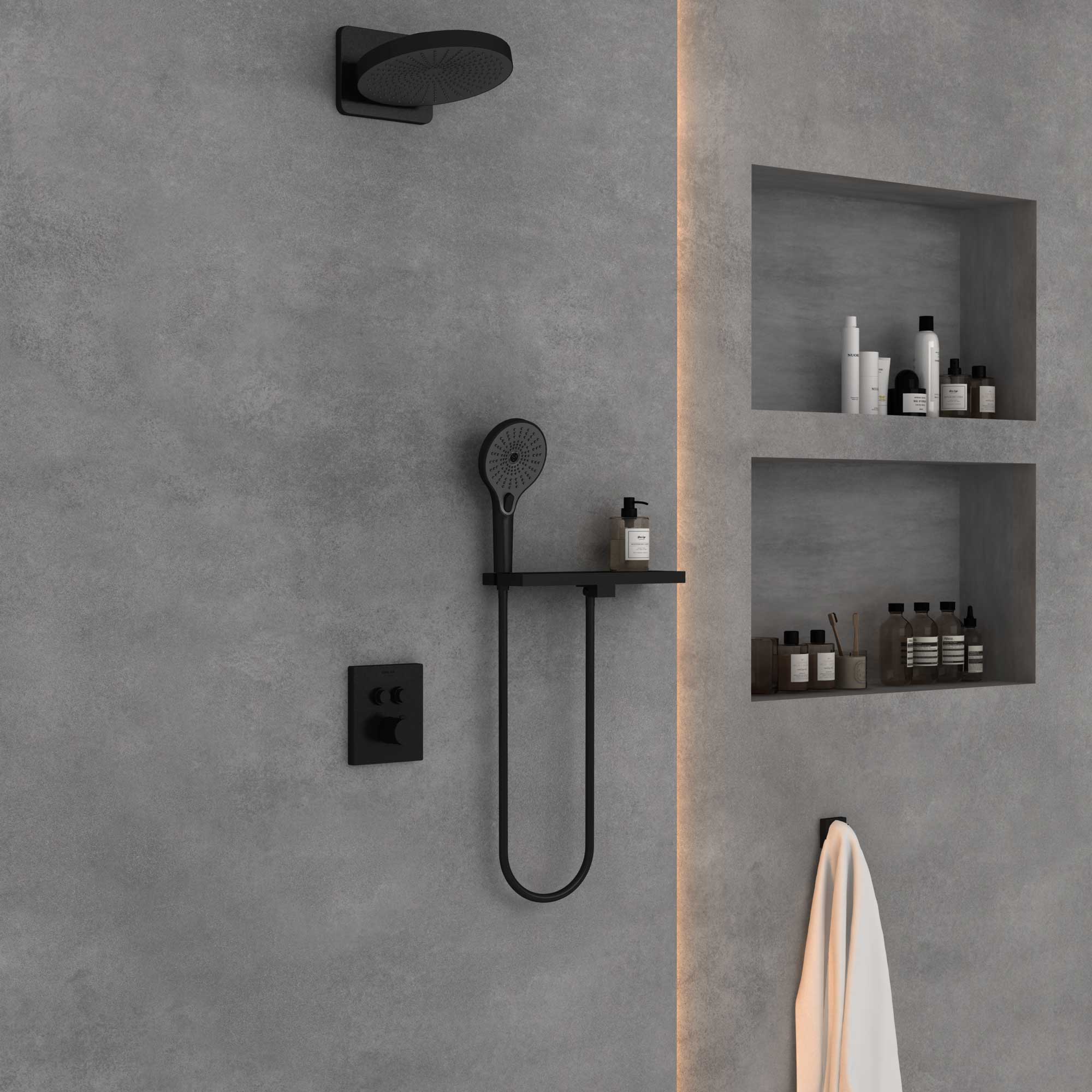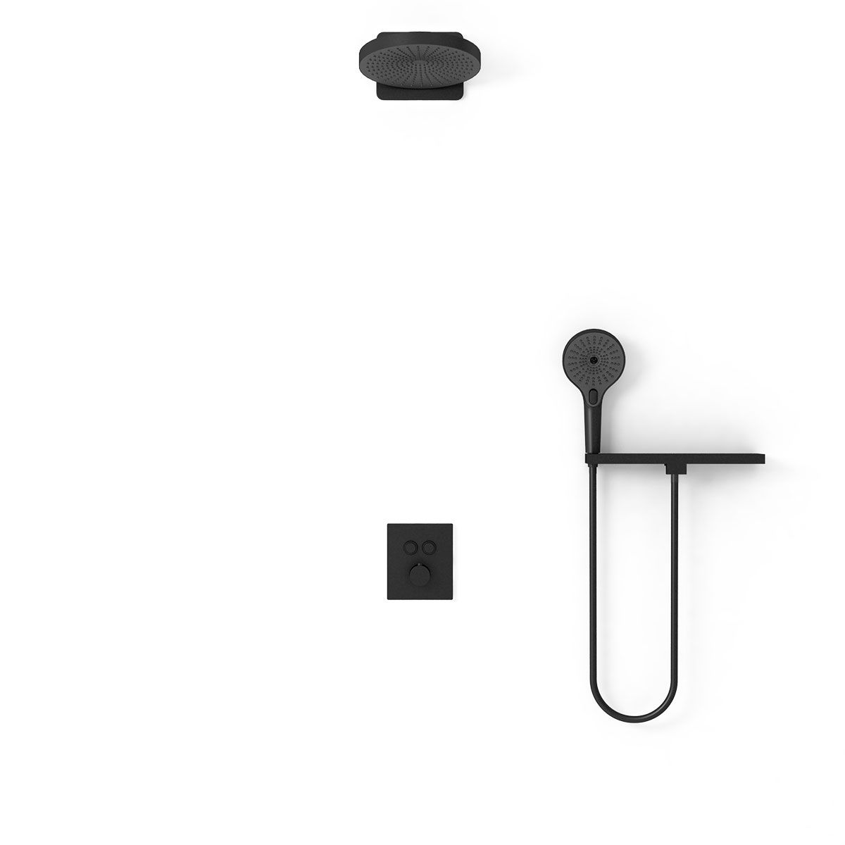 Верхний душ, полка с изливом и держателем ручного душа, ручной душ, смеситель со встраиваемой частью |