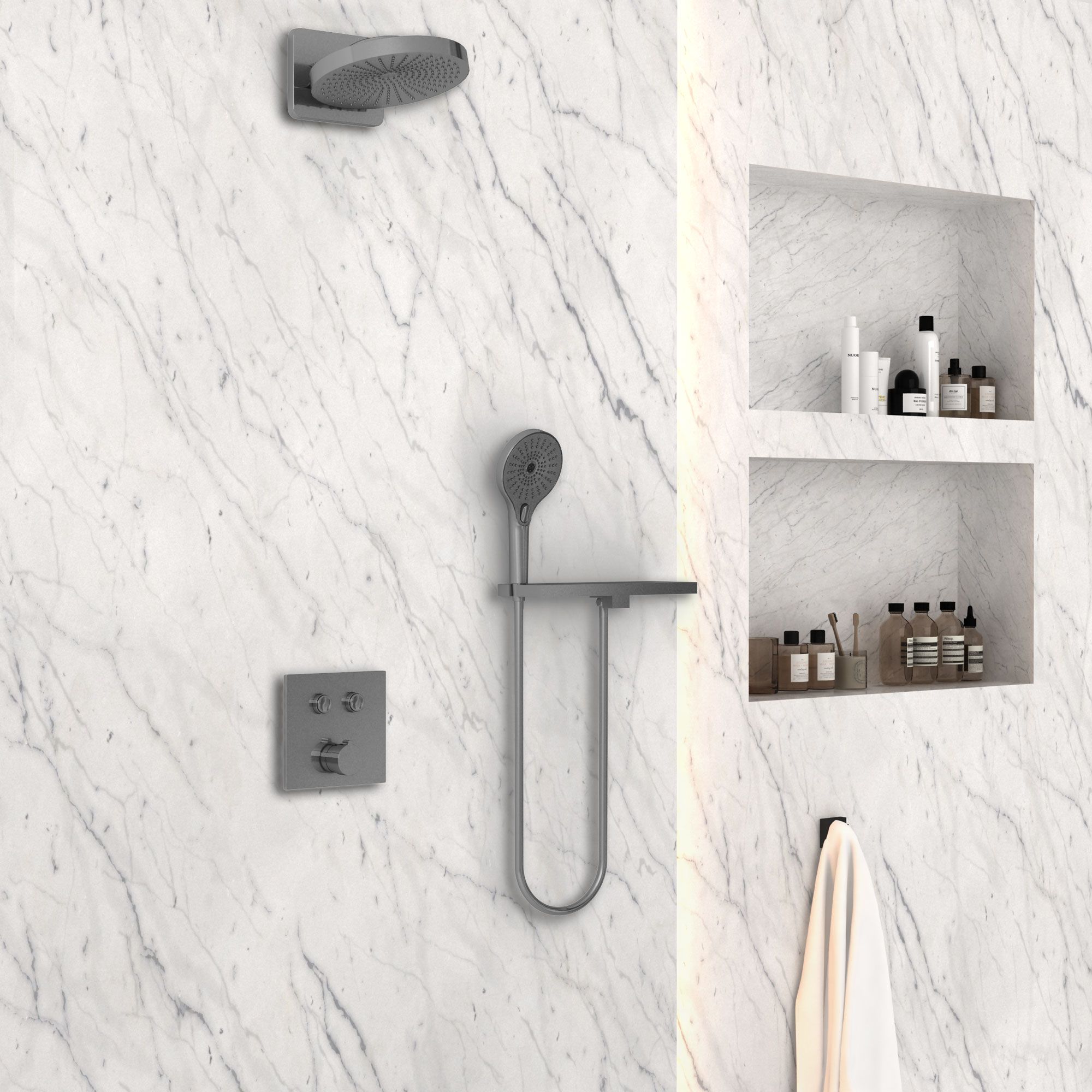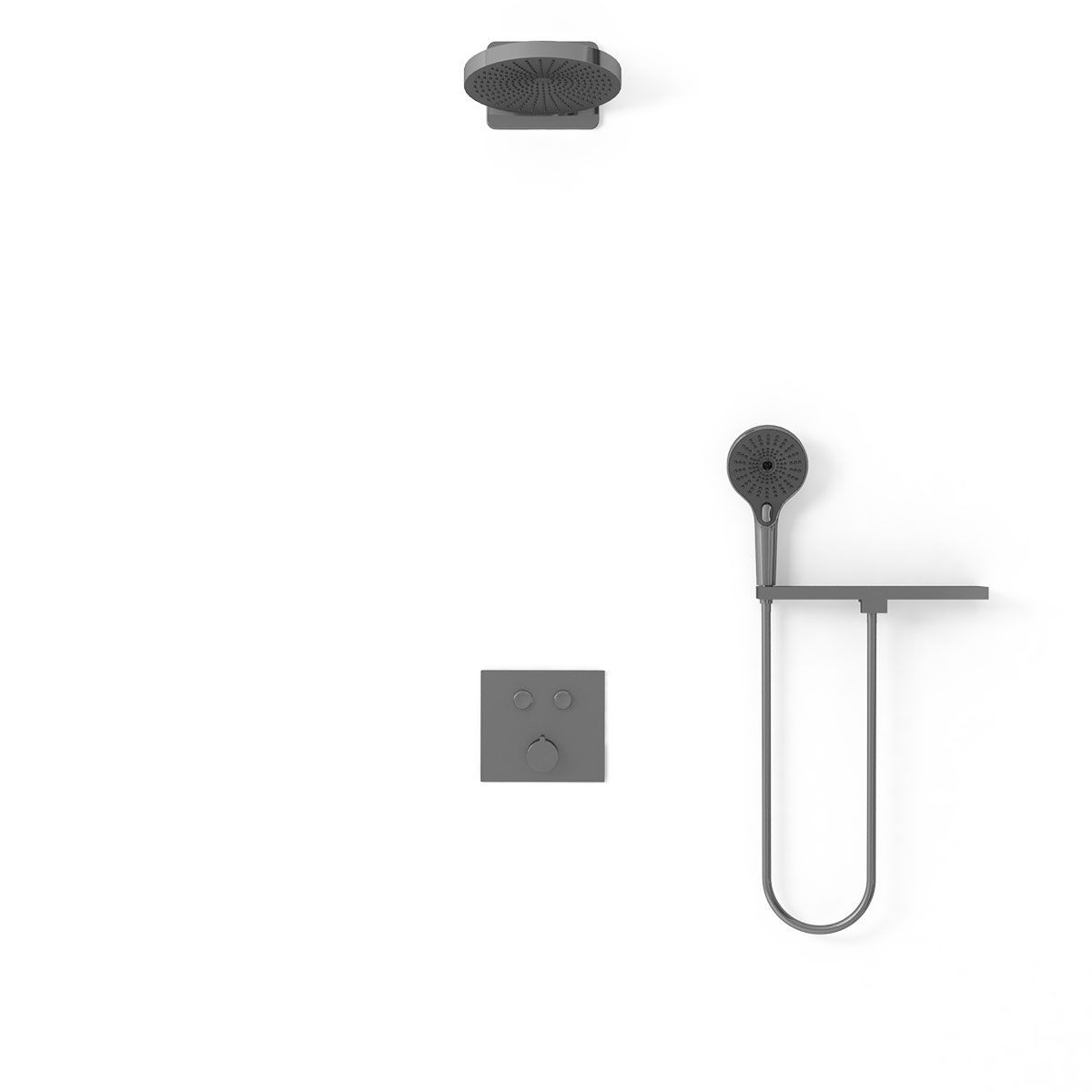 Верхний душ, полка с изливом и держателем ручного душа, ручной душ, смеситель со встраиваемой частью |